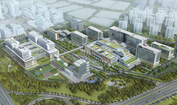 醫院建筑由美國設計公司按照國際理念結合中國國情設計, 采用庭院式布局,著力營造自然療愈空間,采用大面積采光使室內外環境渾然一體。醫院設置醫學轉化中心、模擬訓練中心、進修實習樓、學術報告廳、遠程教學中心,在門診和病區設置數字化MDT中心;配套建設人才公寓,設置員工活動中心和室內外運動場,為醫務人員創造安全舒適的工作、生活環境。